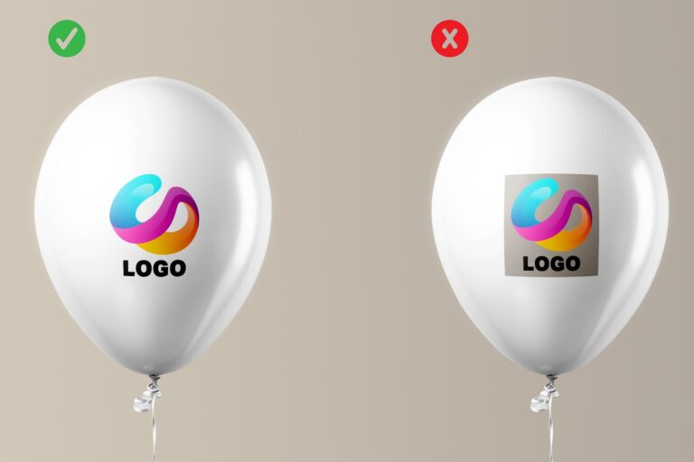 A file with a transparent background (e.g., PNG or vector without fill) integrates perfectly with the color of the balloon, eliminating frames. Below is a comparative visualization with a printed logo without a background and with a background.